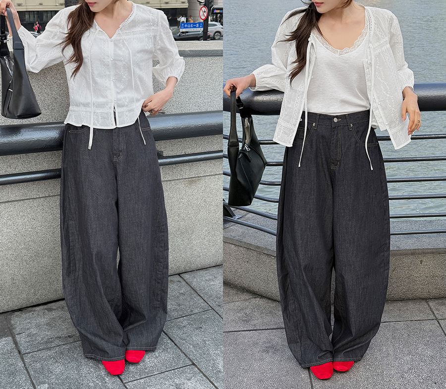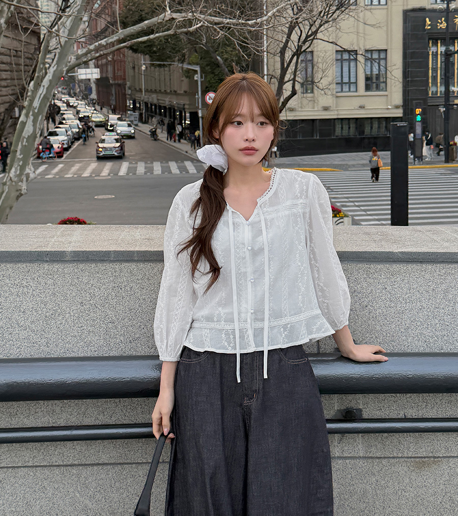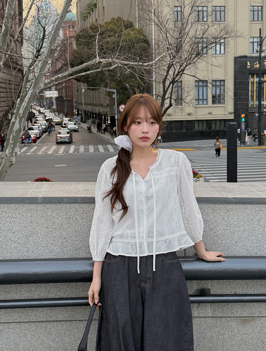 ▶ 단추를 다 잠궈 블라우스로 페미닌하게