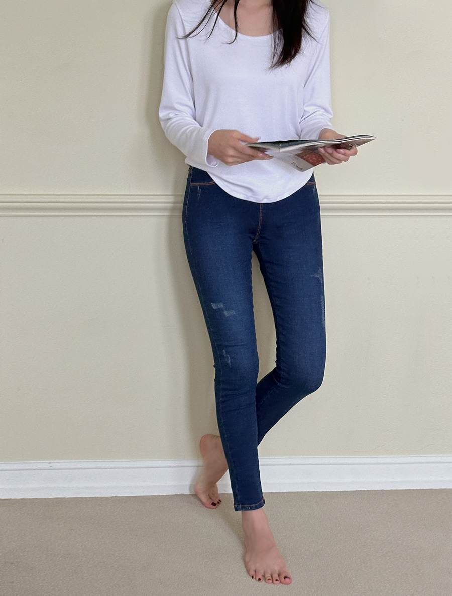 발목정도 내려오는 기장의 스키니핏입니다. 넓은 밴딩이 허리를 탄탄하게 잡아주며, 약간의 스티치가 스타일을 살려주어 티셔츠 하나만 입어도 좋습니다.