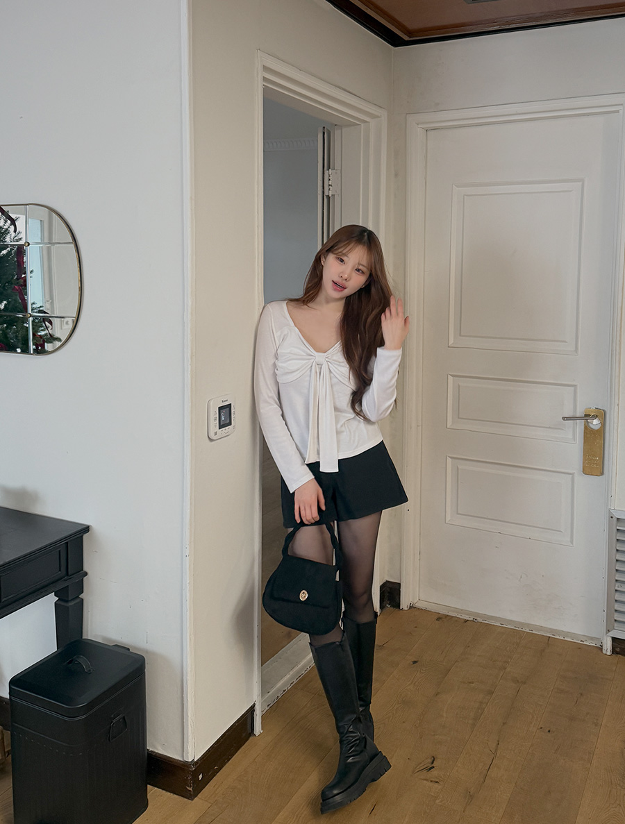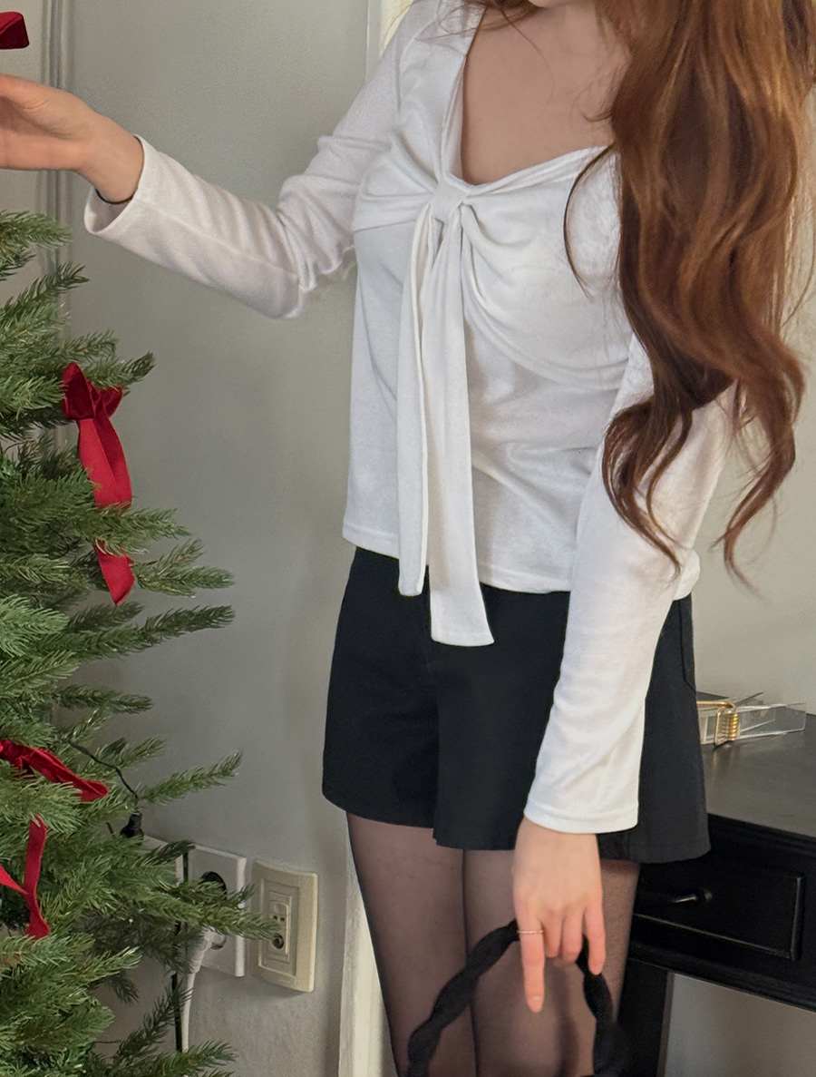 Demuane fleece bowknot shirring T-shirt