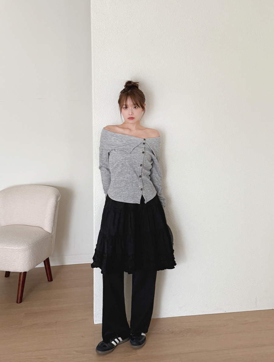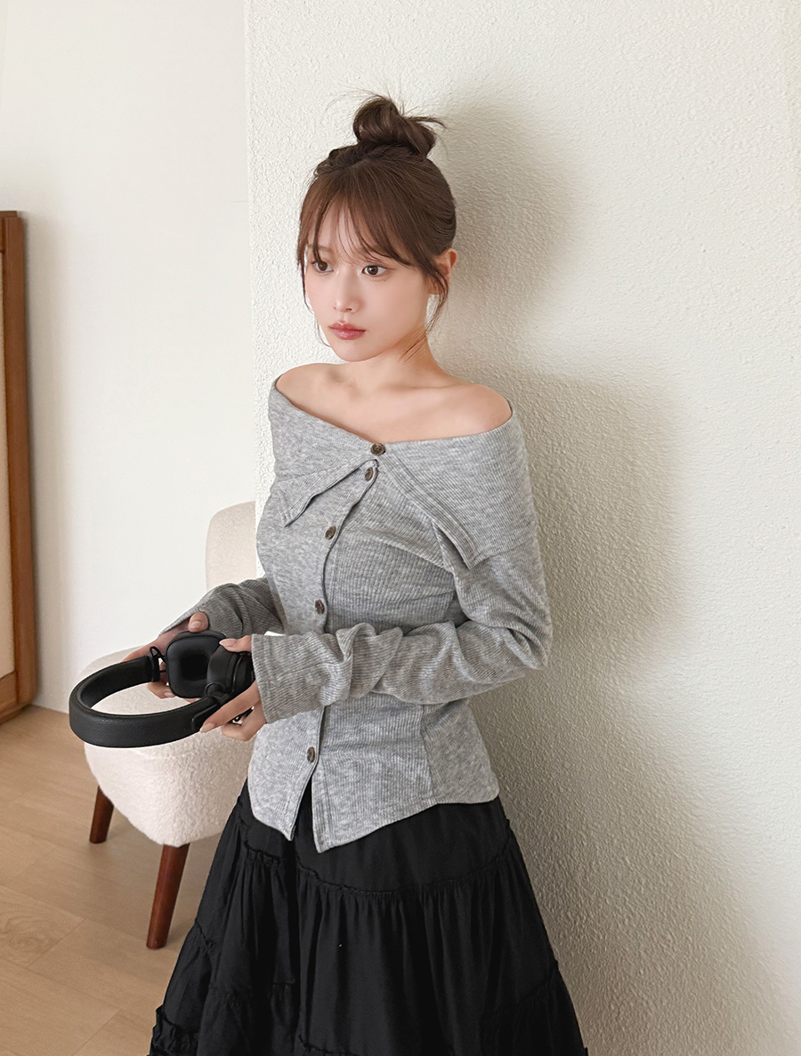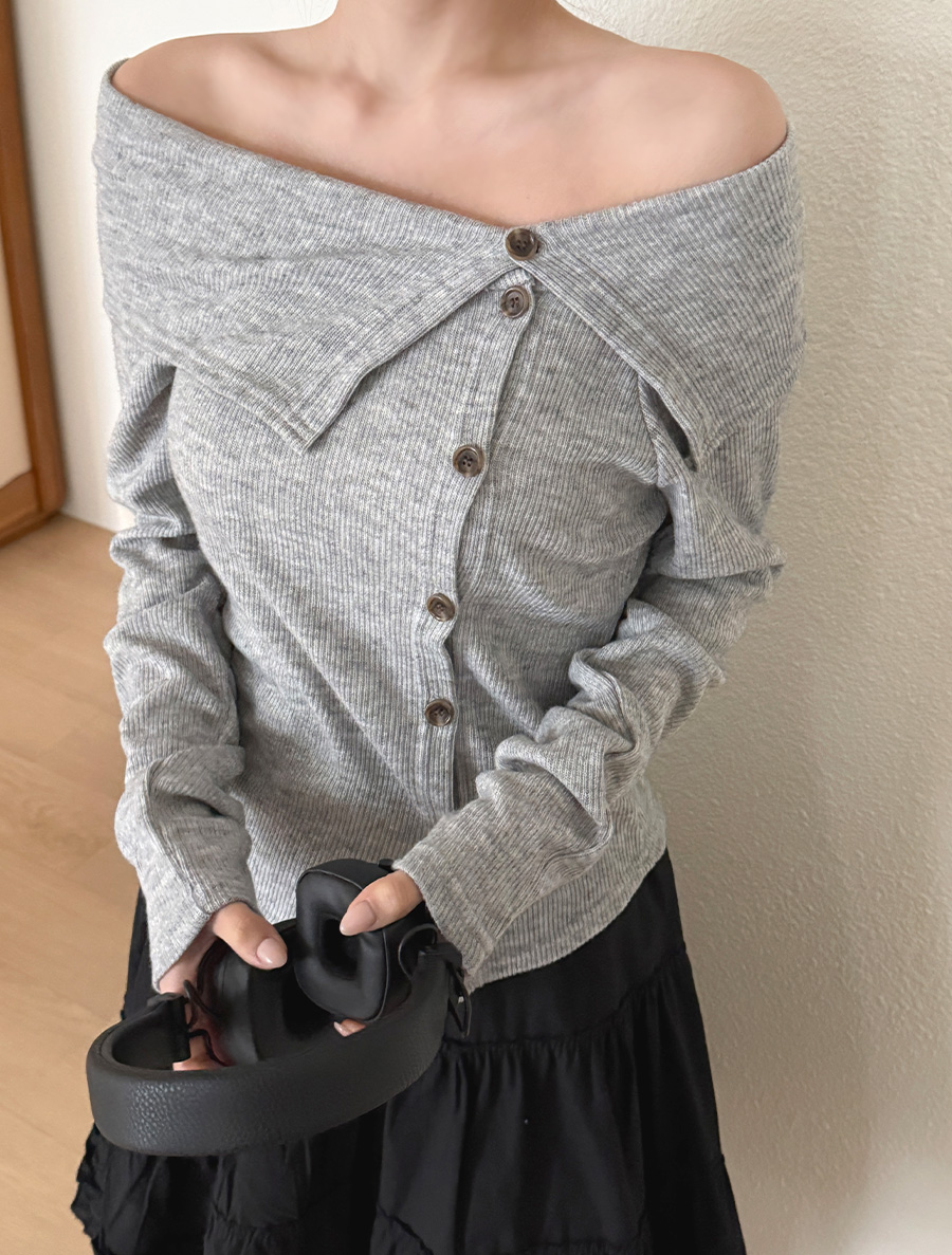 Jerryf Ribbed Off-shoulder Button T-shirt