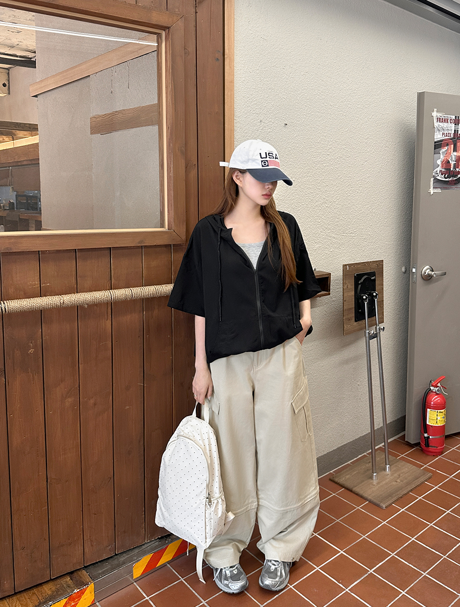 Etiffe Wrinkle two-way Short-sleeve Zip up Hoodies